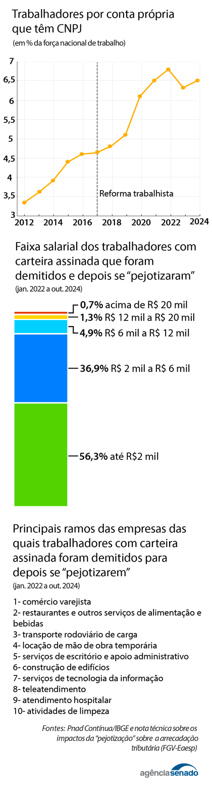 Um estudo do Ministério do Trabalho divulgado em junho mostra que, de todas as pejotizações fraudulentas detectadas pelos auditores-fiscais do Trabalho entre 2022 e 2024, cerca de 56% envolveram trabalhadores com remuneração mensal de no máximo R$ 2 mil.